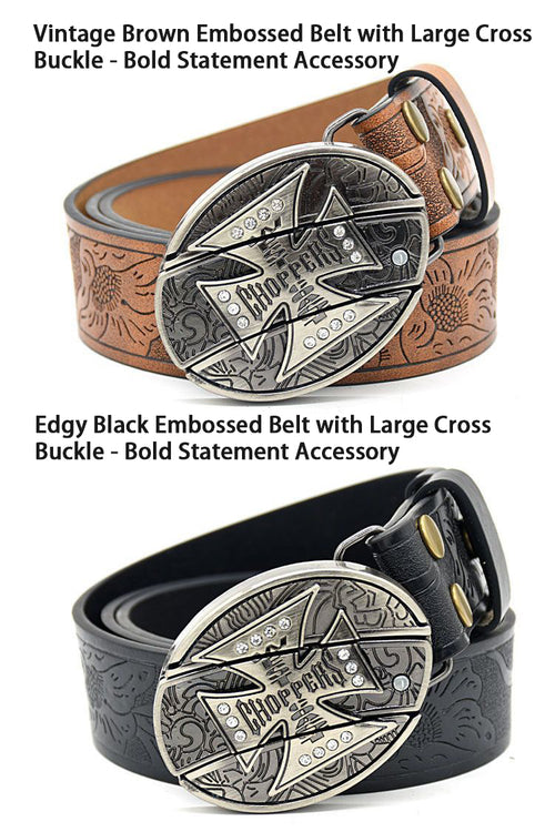 Edgy Men's Large Cross Buckle Belt - Embossed Pattern, Smooth Buckle, Unique Engraved Design
