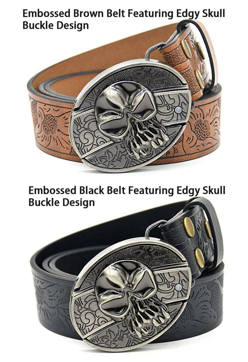 Edgy Men's Skull Buckle Belt - Embossed Pattern, Smooth Buckle, Unique Engraved Design